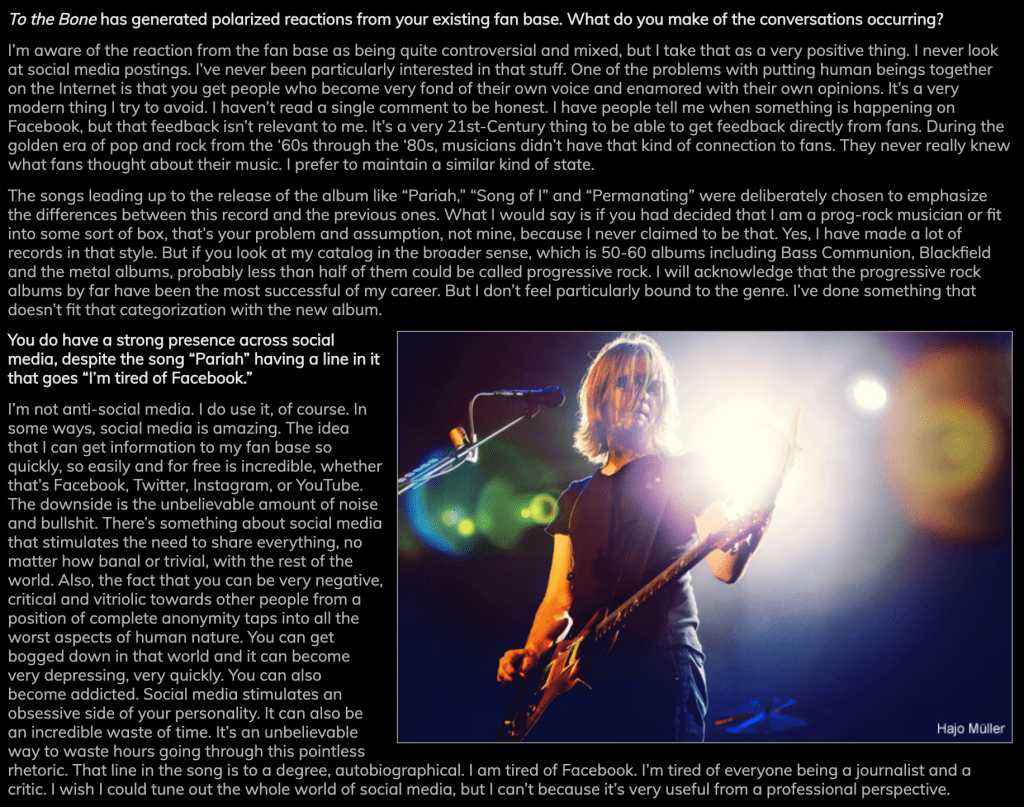 Steven: I’m not anti-social media. I do use it, of course. In some ways, social media is amazing. The idea that I can get information to my fan base so quickly, so easily and for free is incredible, whether that’s Facebook, Twitter, Instagram, or YouTube. The downside is the unbelievable amount of noise and bullshit. There’s something about social media that stimulates the need to share everything, no matter how banal or trivial, with the rest of the world. Also, the fact that you can be very negative, critical and vitriolic towards other people from a position of complete anonymity taps into all the worst aspects of human nature. You can get bogged down in that world and it can become very depressing, very quickly. You can also become addicted. Social media stimulates an obsessive side of your personality. It can also be an incredible waste of time. It’s an unbelievable way to waste hours going through this pointless rhetoric. That line in the song is to a degree, autobiographical. I am tired of Facebook. I’m tired of everyone being a journalist and a critic. I wish I could tune out the whole world of social media, but I can’t because it’s very useful from a professional perspective.