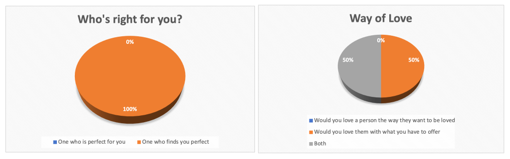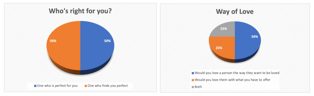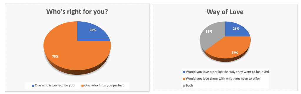 For the second question, of the choice of way of loving the other, 37.5% people said that they would love a person the way they want to be loved, while 25% people said that they will love them with what they have to offer. The interesting fact here was, that 37.5% of people said that both of these actually matters and it is really tough to choose between the two.